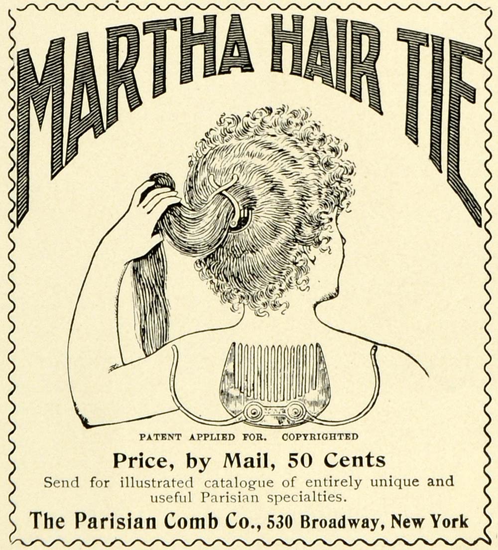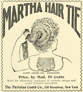 This is a small original 1899 black and white print ad for the Martha Hair Tie, a product by The Parisian Comb Company, located at 530 Broadway in New York.