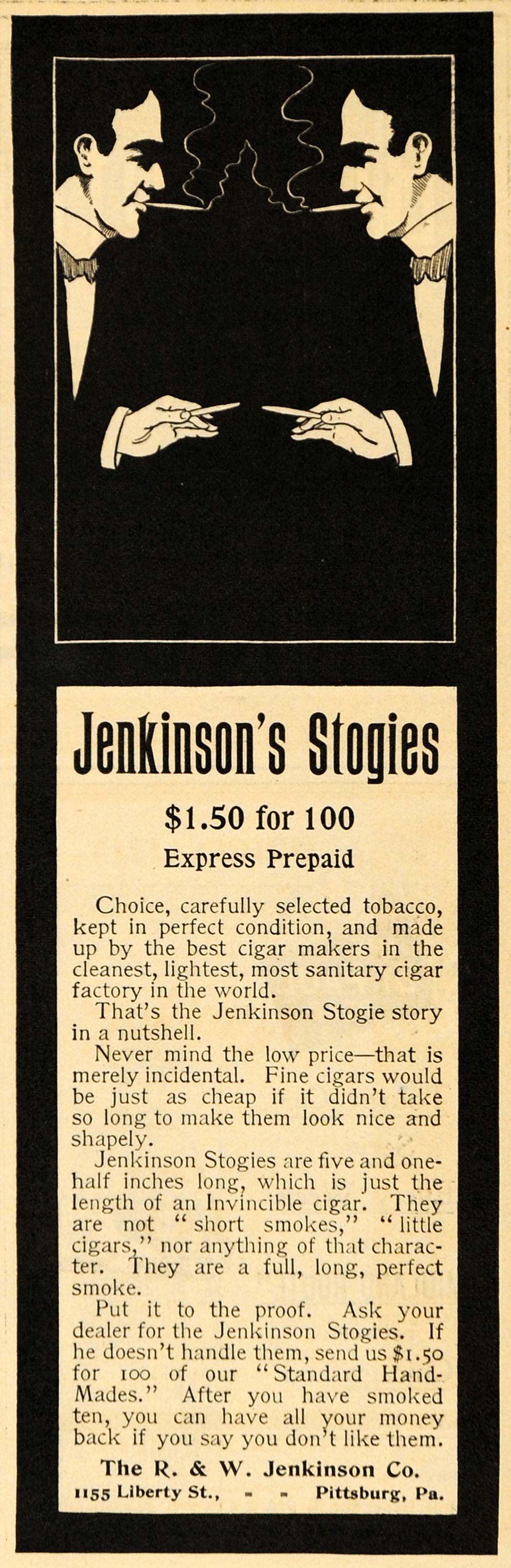 This is an original 1899 black and white print ad for Jenkinson's Stogies by The R. & W. Jenkinson Company located at 1155 Liberty Street, Pittsburgh, Pennsylvania.