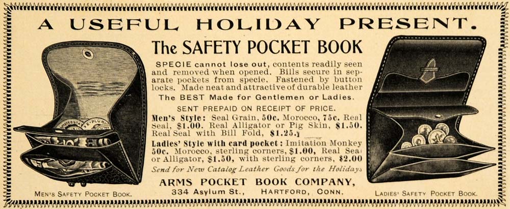 This is a small original 1899 black and white print ad for the Safety Pocket Book by the Arms Pocket Book Company, located at 334 Asylum Street, Hartford, Connecticut.