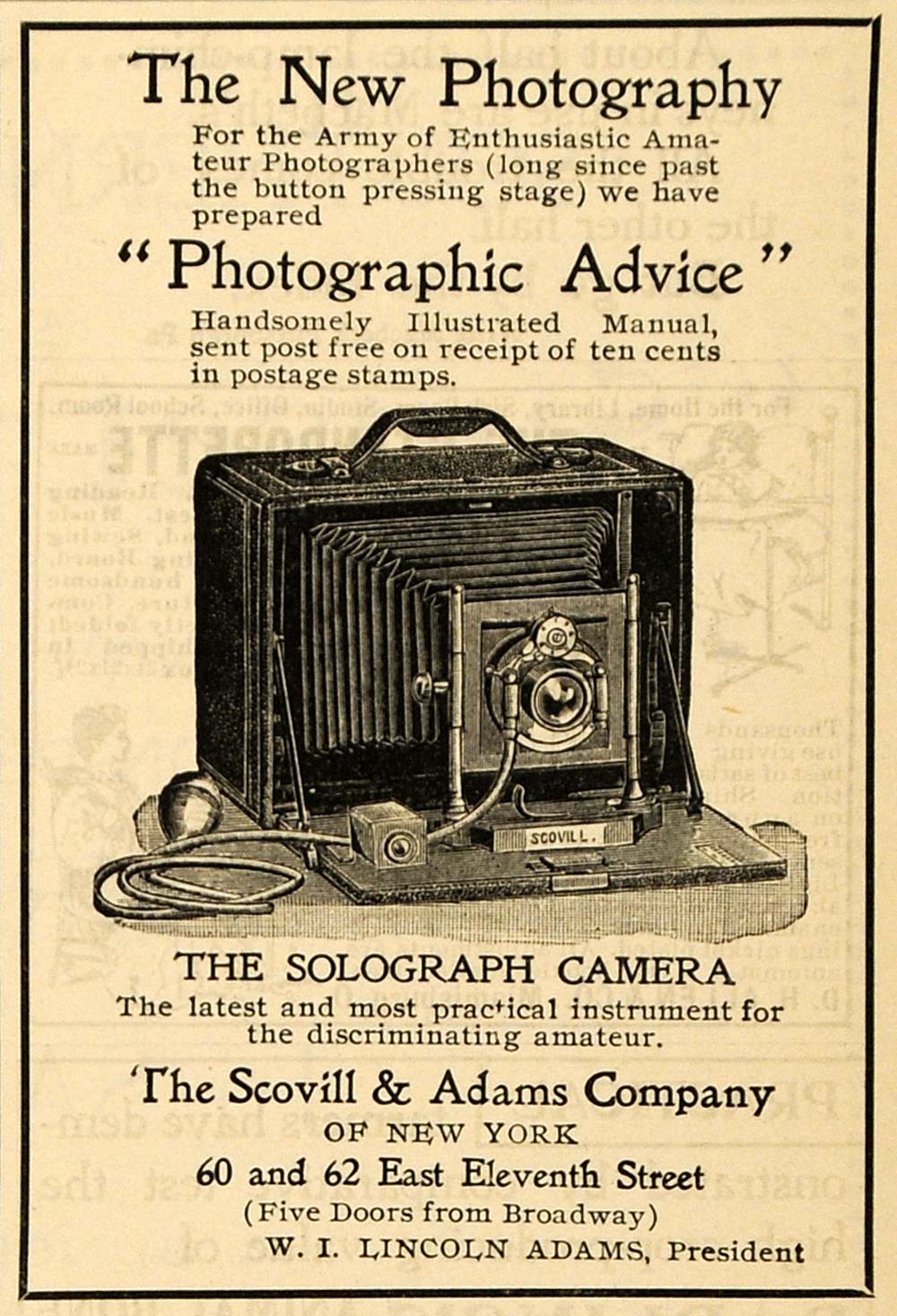This is a small original 1899 black and white print ad for the Solograph Camera from Scovill & Adams Company located at 60 and 62 East Eleventh Street, New York.