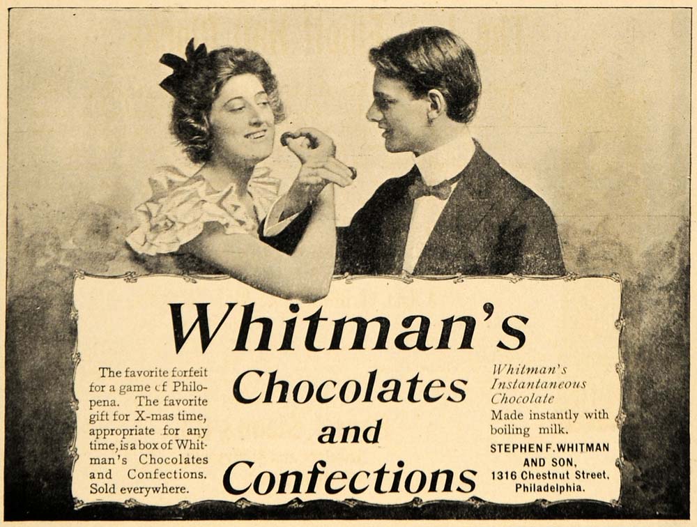 Whitman's Chocolates. The chocolatier and confectionary of WhitmanÕs Chocolates has been in existence since 1842, when an ambitious 19-year old Stephen F. Whitman first opened his candy shop in Philadelphia. European sailors and their wives, who frequently brought chocolate delicacies with them overseas, inspired Whitman to create similar confections that resembled the fine sweets of Europe. However, just prior to the onset of the U. S. Civil War, Whitman began utilizing the latest popular advertising medium of newspapers to further promote his delicacies. By 1866, WhitmanÕs confections exploded in popularity and he was forced to expand his business, thus, occupying the entirety of the building on 12th and Market Streets in Philadelphia. By 1912, the company was the first among its kind to utilize cellophane in its packaging in efforts to preserve maximum freshness among the candies. Today, WhitmanÕs Chocolates remains one of AmericaÕs longest running and most popular confectionaries, though it is now owned by Russell Stover.