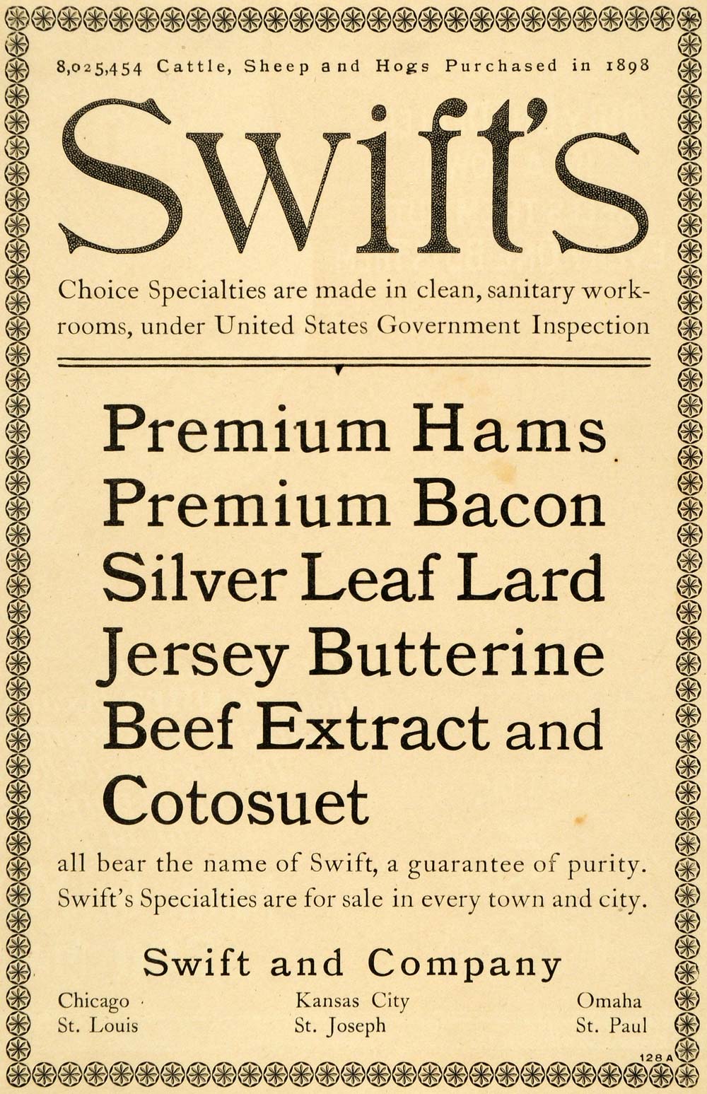 1899 Ad Swifts Premium Ham Bacon Beef Extract Cotosuet Silver Leaf Lard LHJ6