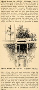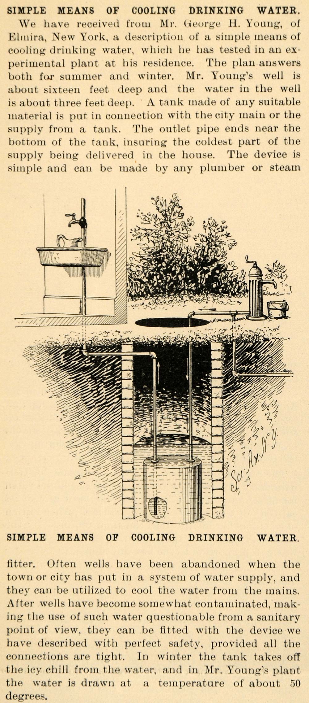 The well is about sixteen feet deep and the water's tank is about three feet deep. The tank was made of suitable material and was put in connection with the city main or the supply from the tank. The outlet pipe ends near the bottom of the tank, insuring the coldest part of the supply being delivered in the house.
