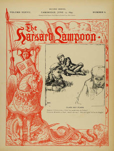 This is an original 1899 two-color cover for the Harvard Lampoon. It features the Harvard Jester sitting on a winged horse, holding up a shield inscribed with the motto VA-NI-TAS (Latin, meaning "empty"), a parody of Harvard's motto, Veritas, or "Truth". The cartoon depicts a trio of young men deciding how to spend Class Day.CONDITION