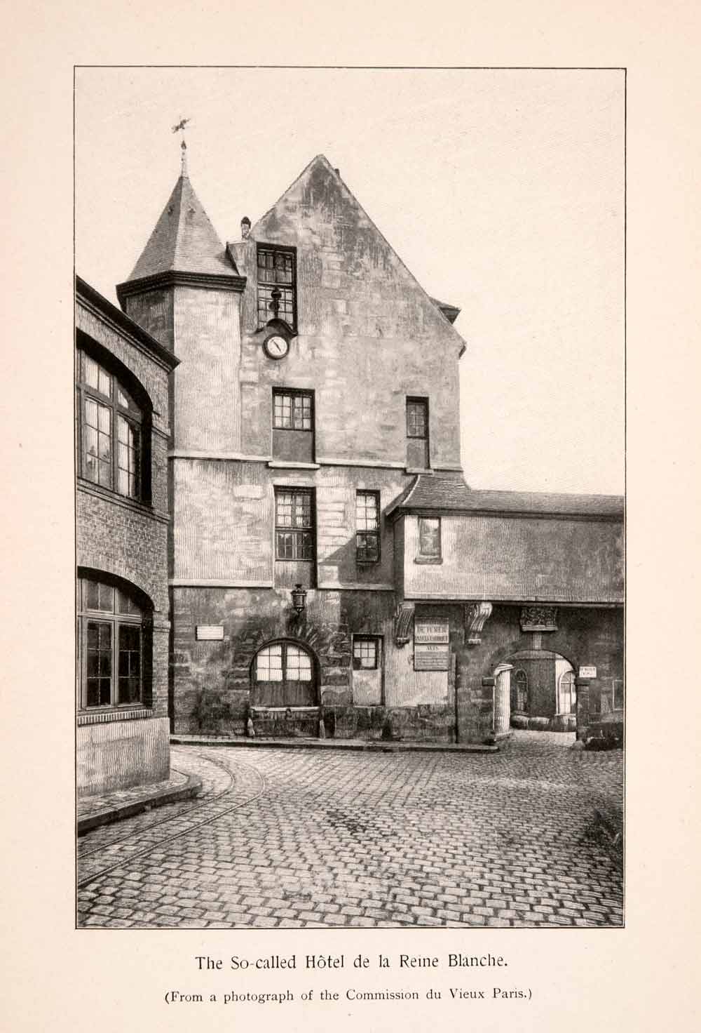 This is an original 1899 black and white halftone print of the Hôtel de la Reine Blanche in Paris, France. It was here that Charles VI held the infamous