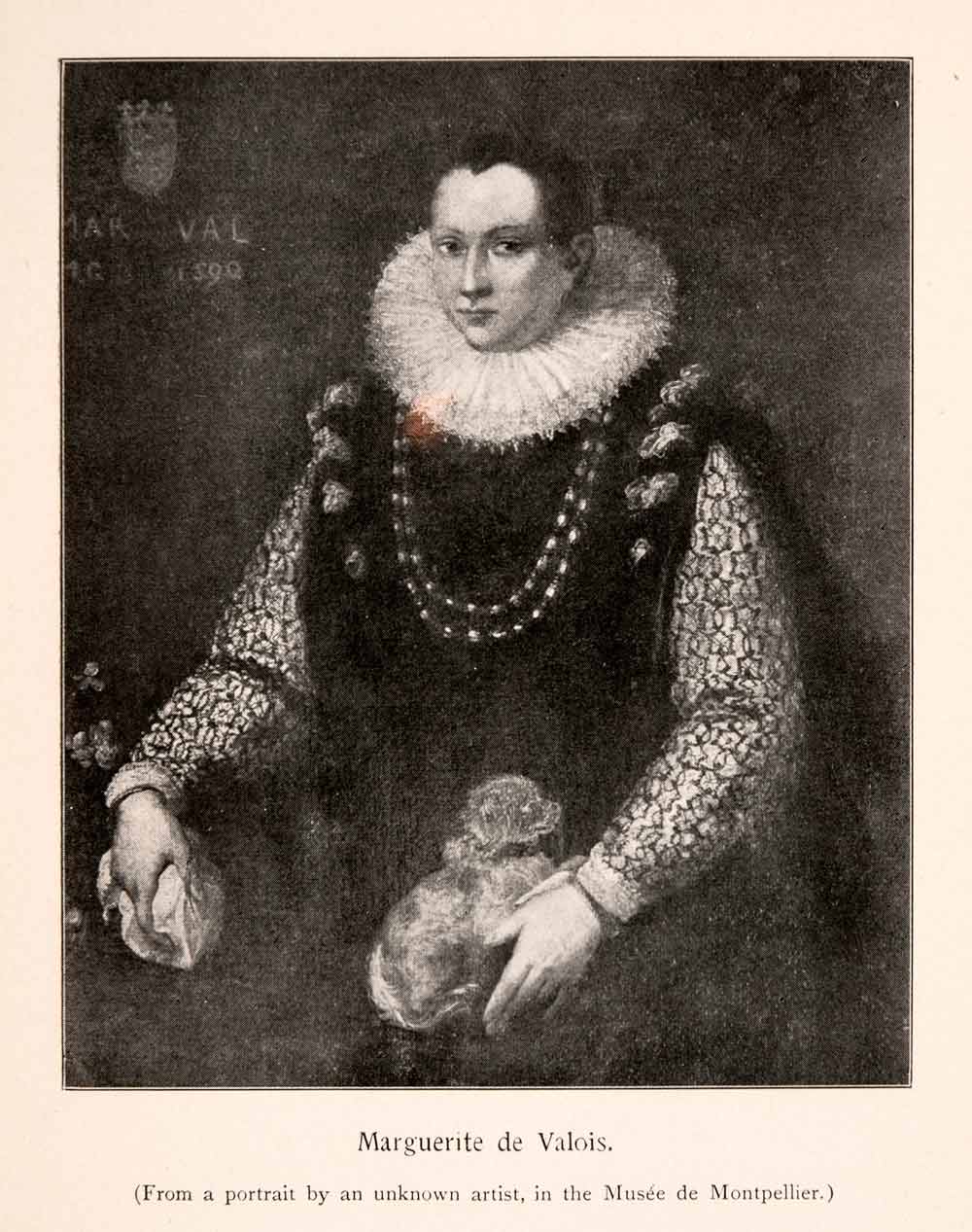 This is an original 1899 black and white halftone print of Marguerite de Valois, Queen of Navarre and France during the late 16th century. She was an avid writer, fond of both creating scandals and writing of the scandals of others. As a result, many famous authors have drawn ideas from the events in her life, including Shakespeare (in his early