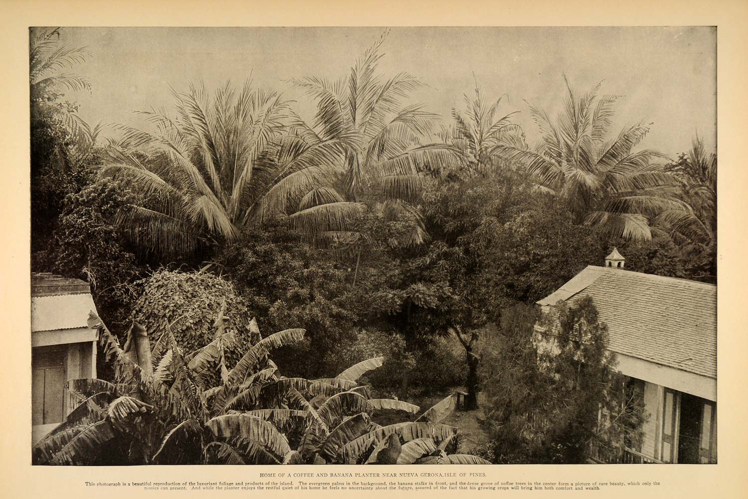 This is an original 1899 halftone print of the home of a coffee and banana planter near Nueva Gerona on the Isla de Pinos (or as it is known now -- Isla de la Juventud) in Cuba. (Please note that there is printing on the reverse.)