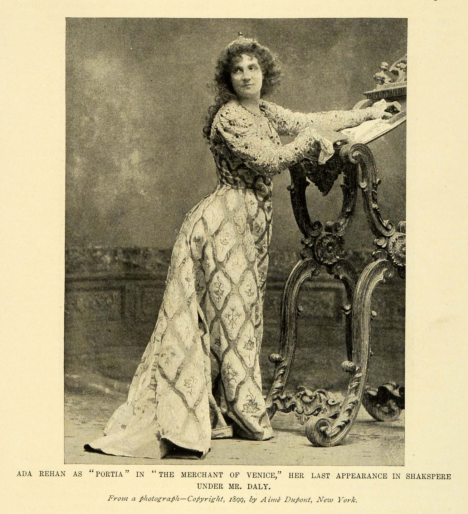 This is an original 1899 halftone print of a portrait of American stage actress Ada Rehan as "Portia" in "The Merchant of Venice." This was Rehan's last appearance in Shakespeare under Mr. Augustin Daly. Photography by Aime Dupont of New York.