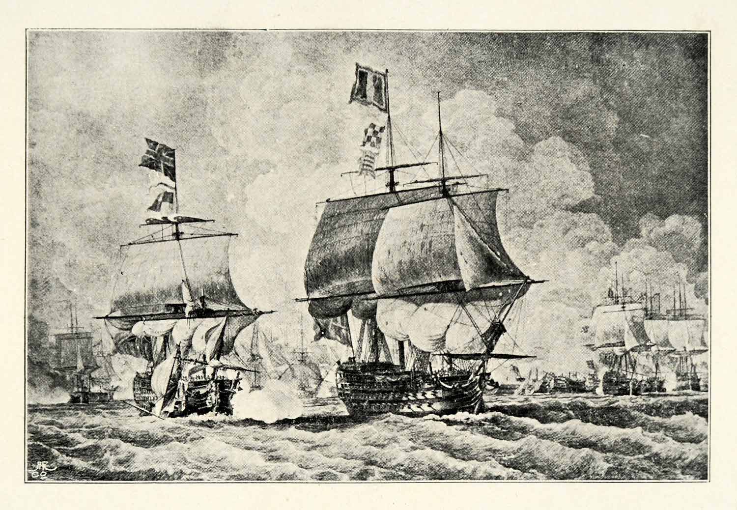 This is an original 1899 halftone print of the British Royal Navy at war with the French Navy during the 1780 Battle of Martinique.