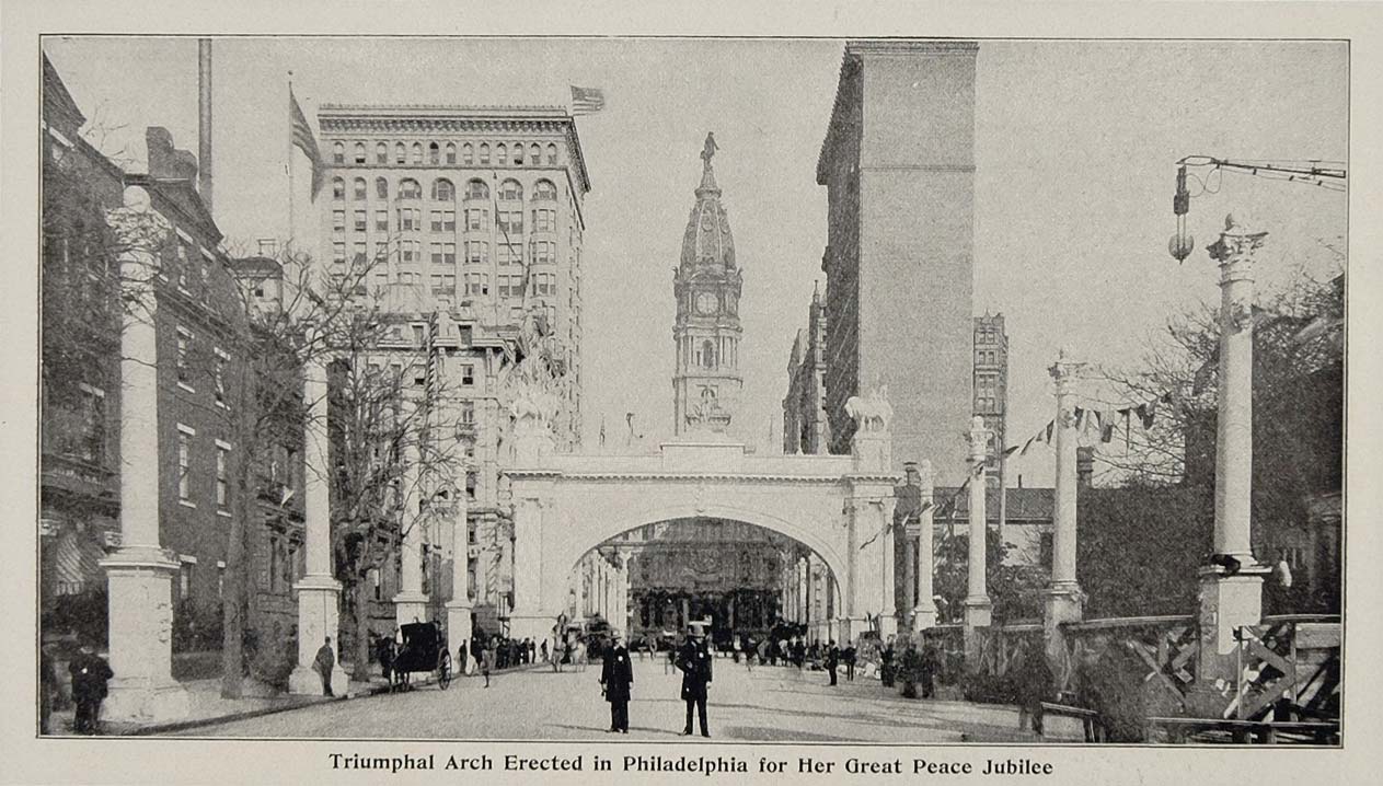 This is an original 1899 halftone print of the Triumphal Arch and Court of Honor erected for the Peace Jubilee which was a celebration held in Philadelphia in October of 1898 as the Spanish-American War was nearing an end.