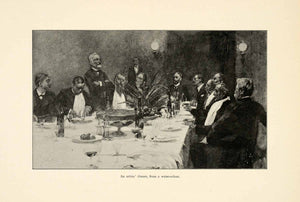 This is an original 1899 halftone print of artists sitting around a dinner table. The original was painted by Nicolaas van der Waay.