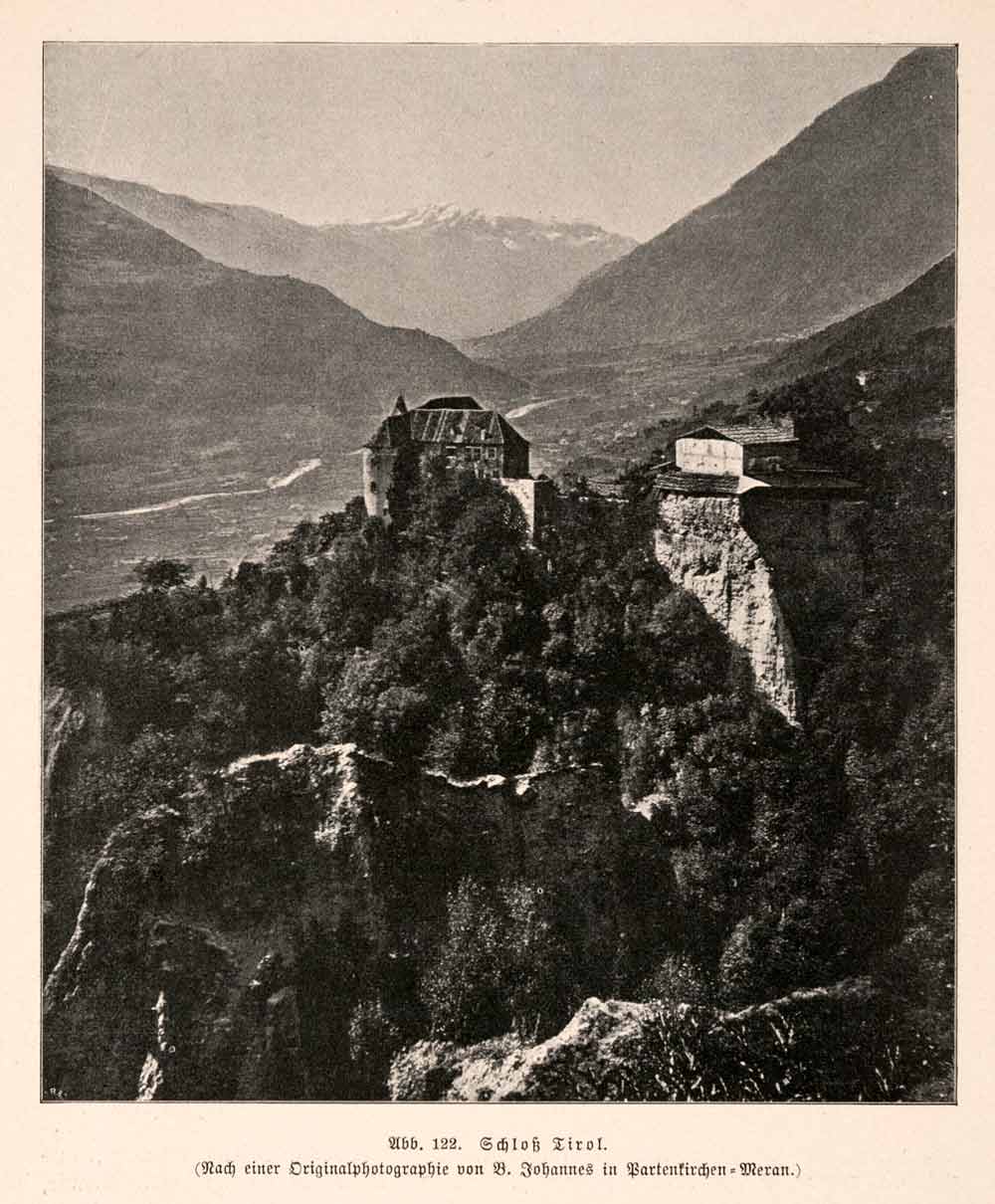 This is an original 1899 halftone print of the magnificent Tirol Castle, seat of the ancient Counts of Tirol who gave the region their name. Dating as far back as the early Middle Ages, this Medieval fortress held a wealth of archeological finds, and today is known as the South Tyrol Museum of Culture and History.