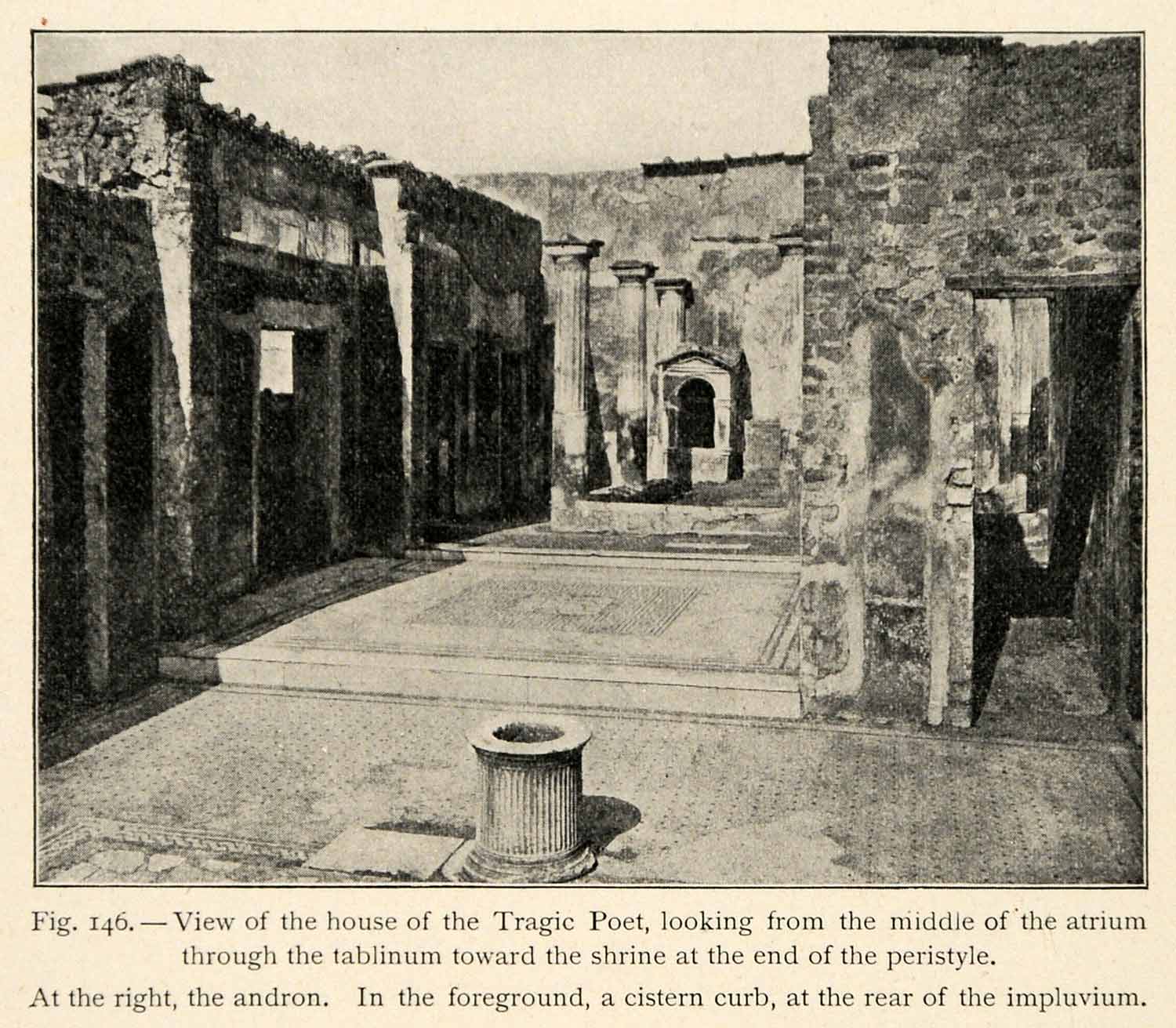 This is an original 1899 black and white halftone print of the House of the Tragic Poet located in the Roman ruins of Pompeii, Italy. As the poet's living would have been made from tragedy, this poet picked the perfect real estate for their profession.