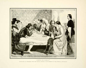 Lorenzo and Isabella, it depicts a scene from John Keats' poem of the same name. In this scene, Lorenzo can be seen passing his secret lover Isabella a sliced blood orange, while one of Isabella's brothers across the table kicks the dog.