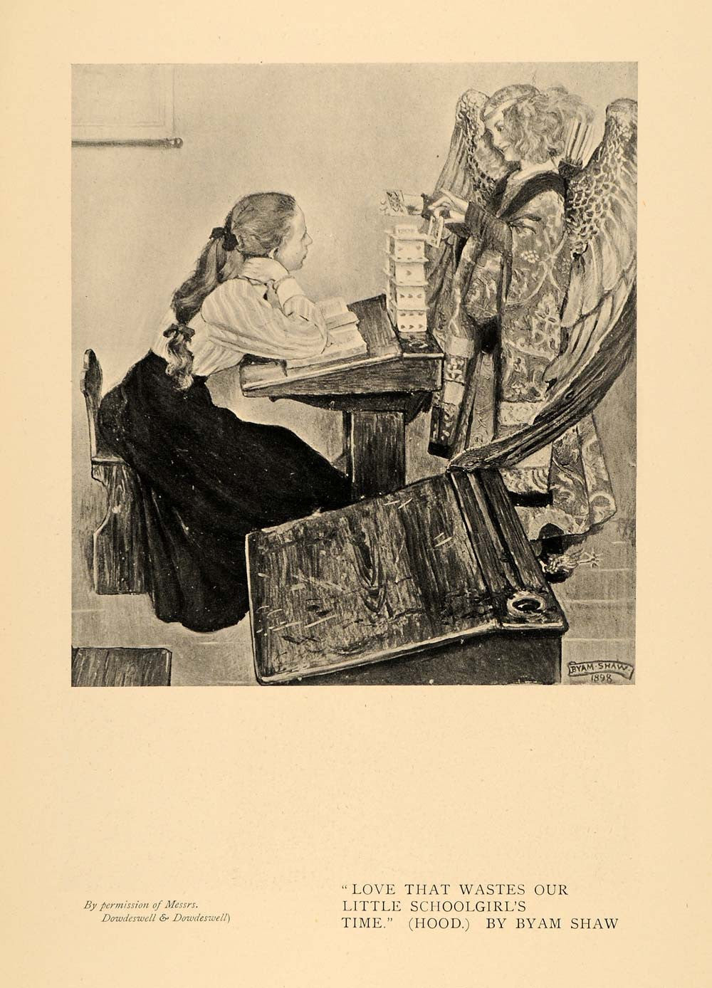 This is an original 1899 halftone print of Love that Wastes our Little Schoolgirl's Time by Byam Shaw. This is a beautiful image of a school girl getting distracted by 'love'. This is a very creative way of representing love in this child's mind. Love here is an angel dressed in a lavish dress, with arrows behind her. She has a big, coy smile and is building a pyramid with hearts cards in front of this young girl. Shaw does a great job of showing what schoolgirls really think about.