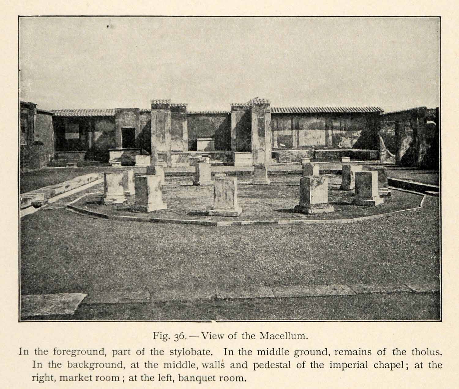 This is an original 1899 black and white halftone print of the ruins of the Macellum in the ancient Roman city of Pompeii, Italy.