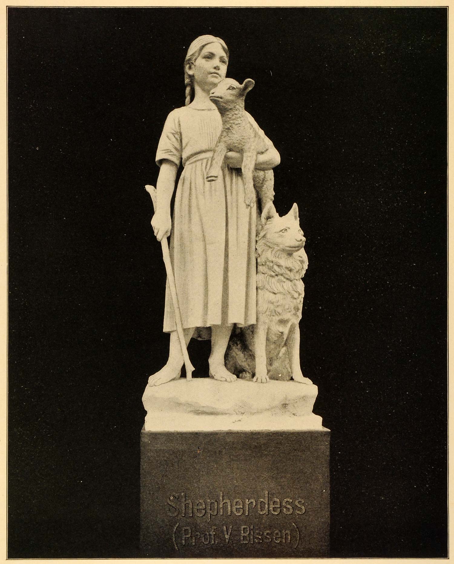 This is an original 1899 halftone print of the sculpture by Professor V. Bissen of Denmark titled "Shepherdess," which was featured in the Palace of Fine Arts at the 1893 Chicago World's Fair (also referred to as the Columbian Exposition).