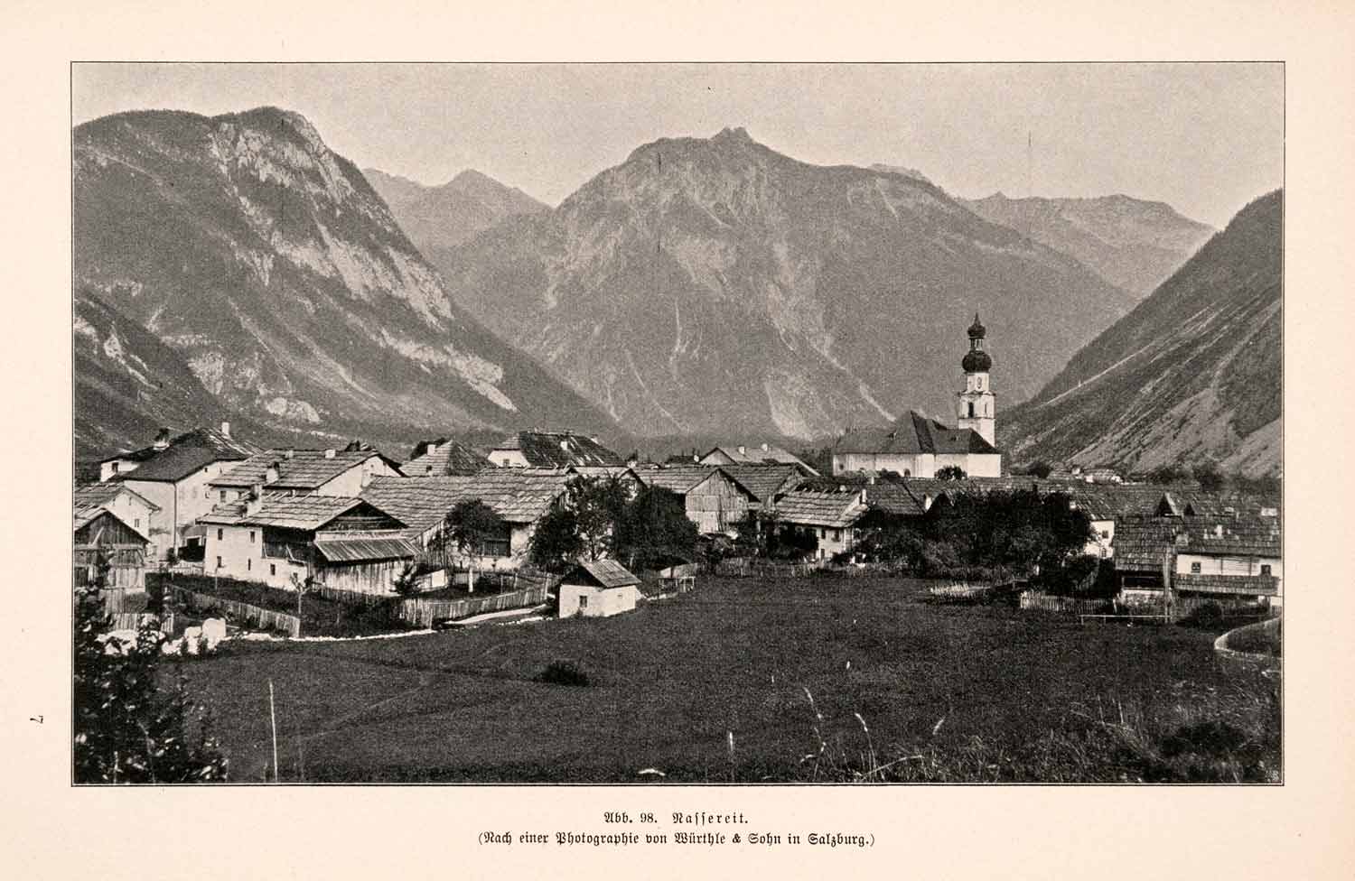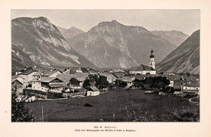 This is an original 1899 halftone print of the small town of Nassereith in Tyrol, Austria. The large bulbous spire of its parish church is almost instantly recognizable.