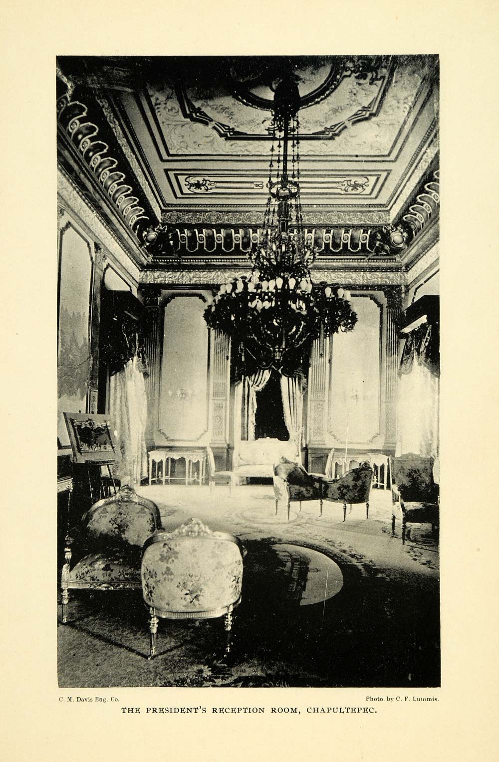 This is an original 1899 halftone print of the President's Reception Room in Chapultepec Castle in Chapultepec Park, Mexico City. This place has served as many different venues over the years, including a museum, military academy, Presidential residence, and the Museo Nacional de Historia.