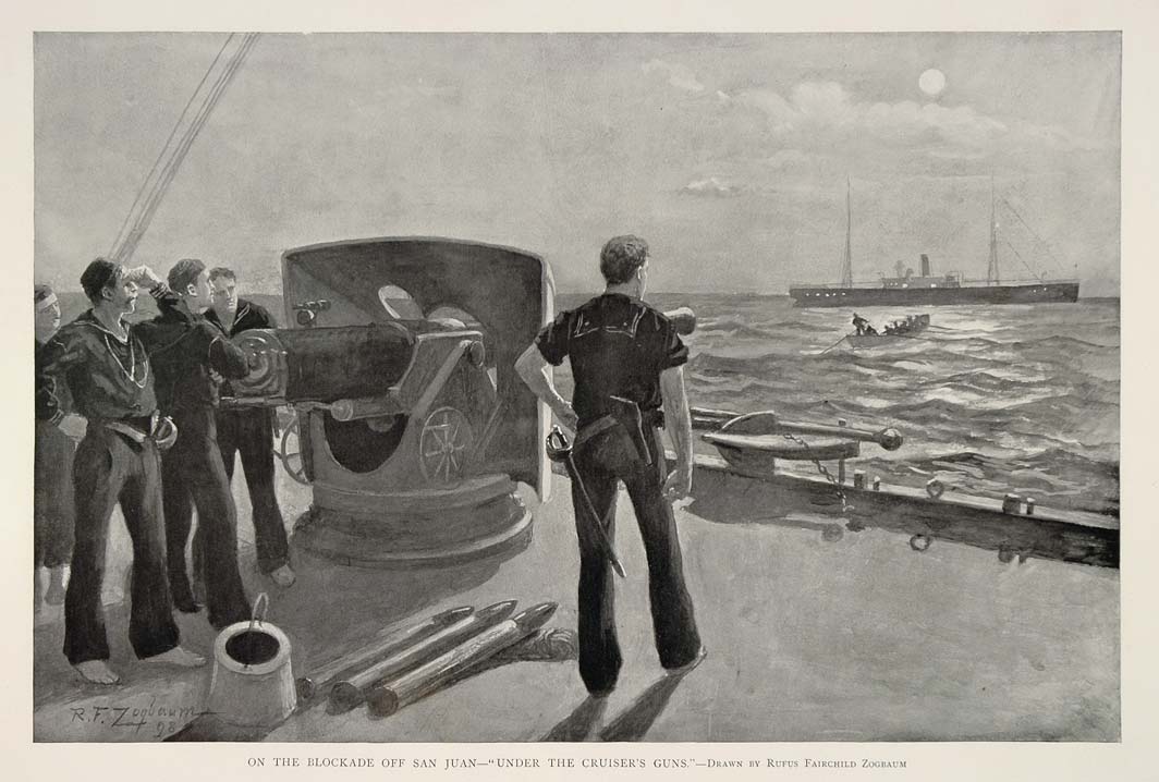 This is an original 1899 black and white print of the naval blockade of San Juan, Puerto Rico, during the Spanish-American War of 1898.