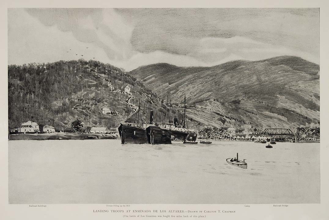 This is an original 1899 black and white print of U. S. troops landing at Ensenada de los Altares during the Spanish-American War of 1898.