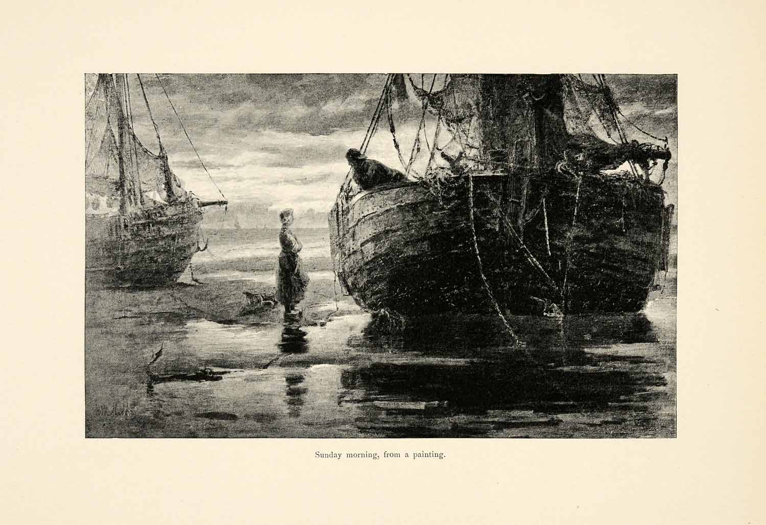 This is an original 1899 halftone print of ships harbored on a beach. You can guess the narrative is the man and woman know each other and he's returning home or just about to leave. The original painting was by Henry William Mesdag.