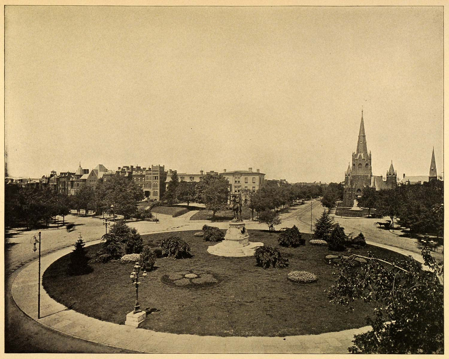 This is an original 1899 halftone print of Thomas Circle in Washington, D. C.