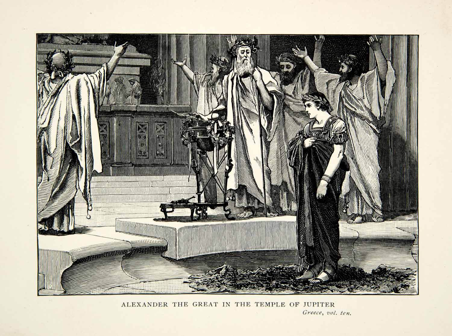 This is an original 1899 black and white wood engraving of Alexander the Great in the Temple of Jupiter during classical antiquity.