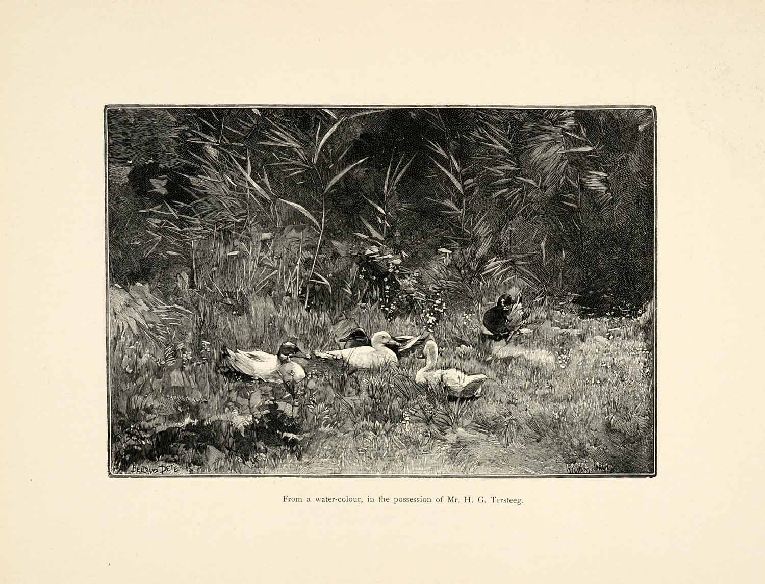 This is an original 1899 black and white wood engraving of ducks on grass. The woodcut is by William Maris.