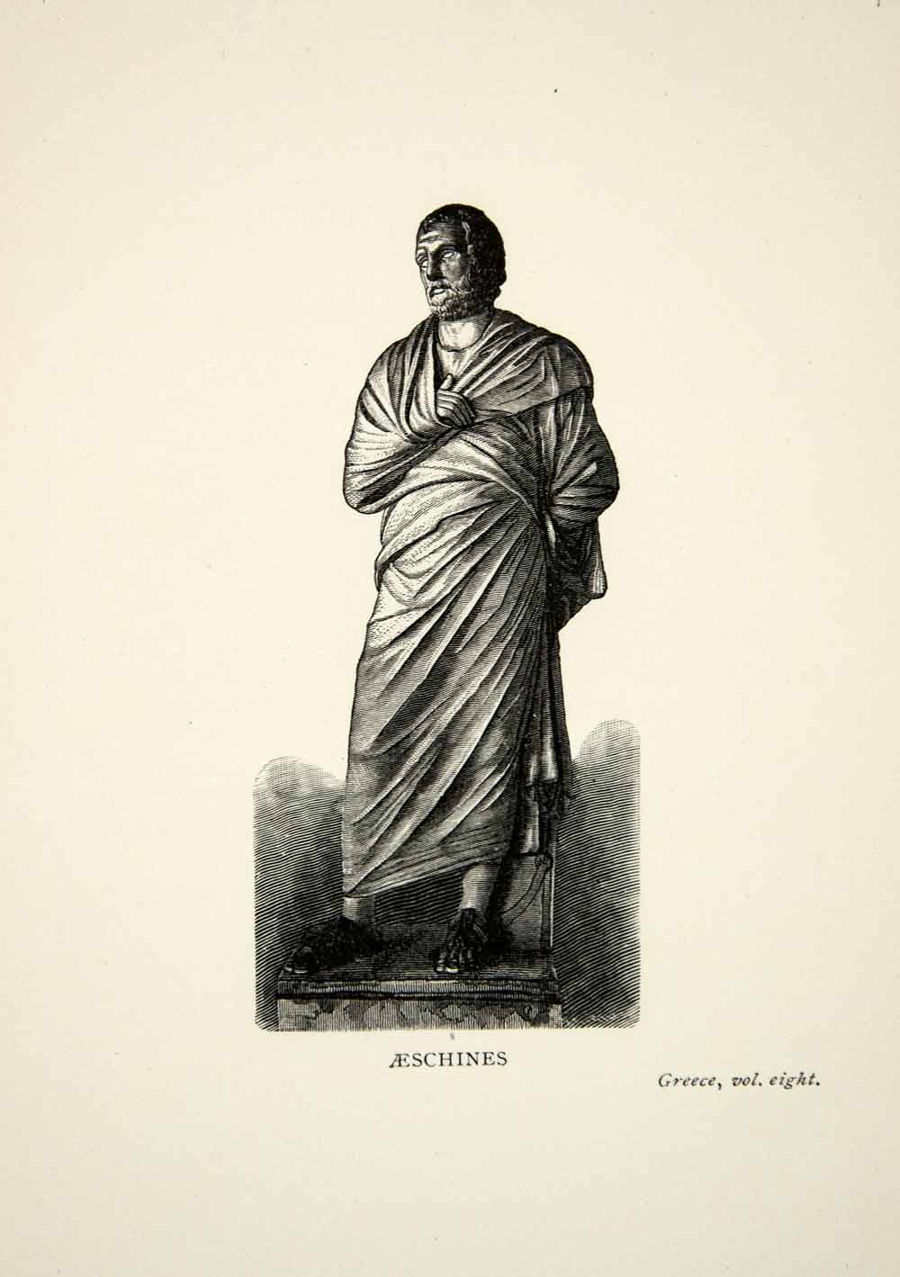 This is an original 1899 black and white wood engraving of a sculpture of the Greek statesman Aeschines.