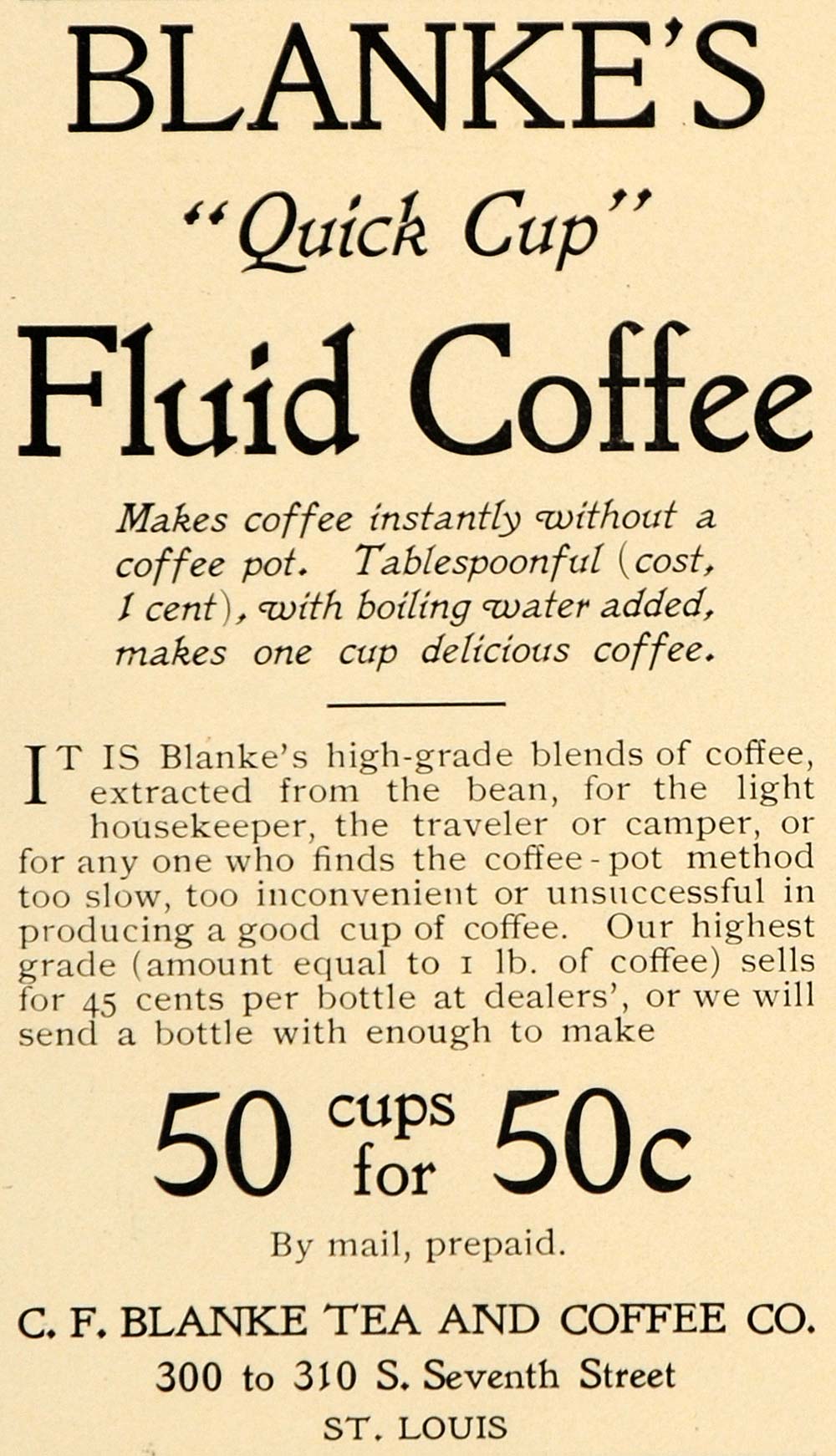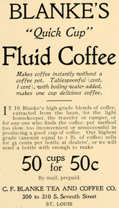 This is a small original 1900 black and white print ad for Blanke's Quick Cup Fluid Coffee from the C. F. Blanke Tea and Coffee Co. located in St. Louis.