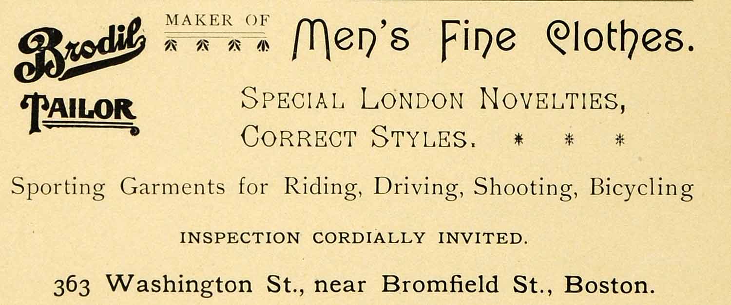 This is an original 1900 black and white print ad from the Harvard Lampoon for Brodil, maker and tailor of men's clothes, located at 363 Washington St, in Boston.