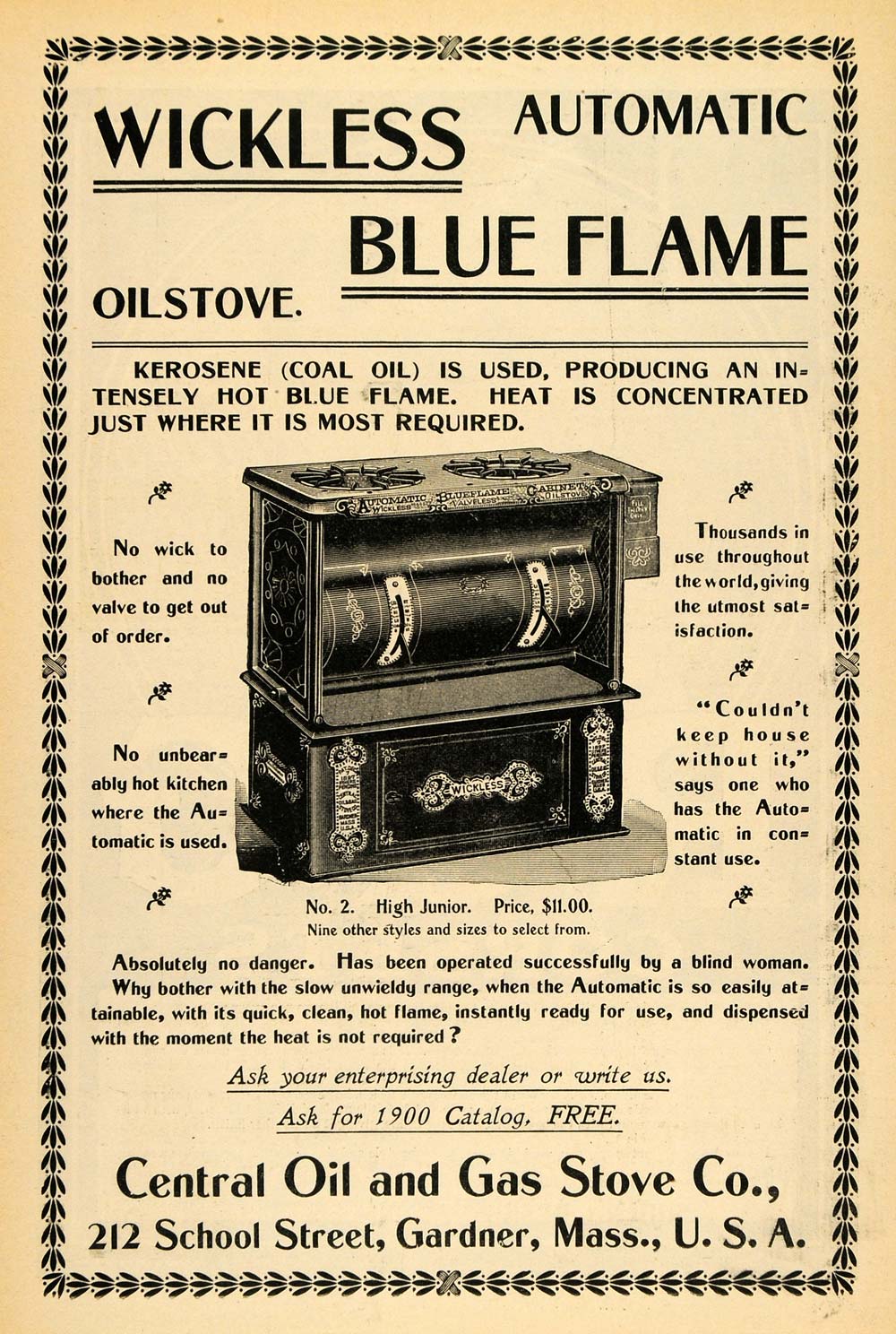 This is an original 1900 black and white print ad for Wickless Automatic Blue Flame Oilstove by the Central Oil and Gas Stove Company located at 212 School Street, Gardner, Massachusetts.