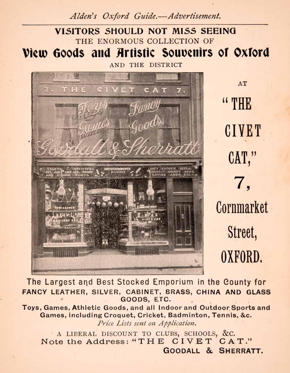 This is an original 1900 black and white print ad for the Civet Cat goods and artistic souvenirs shop located at 7 Cornmarket Street in Oxford, England.