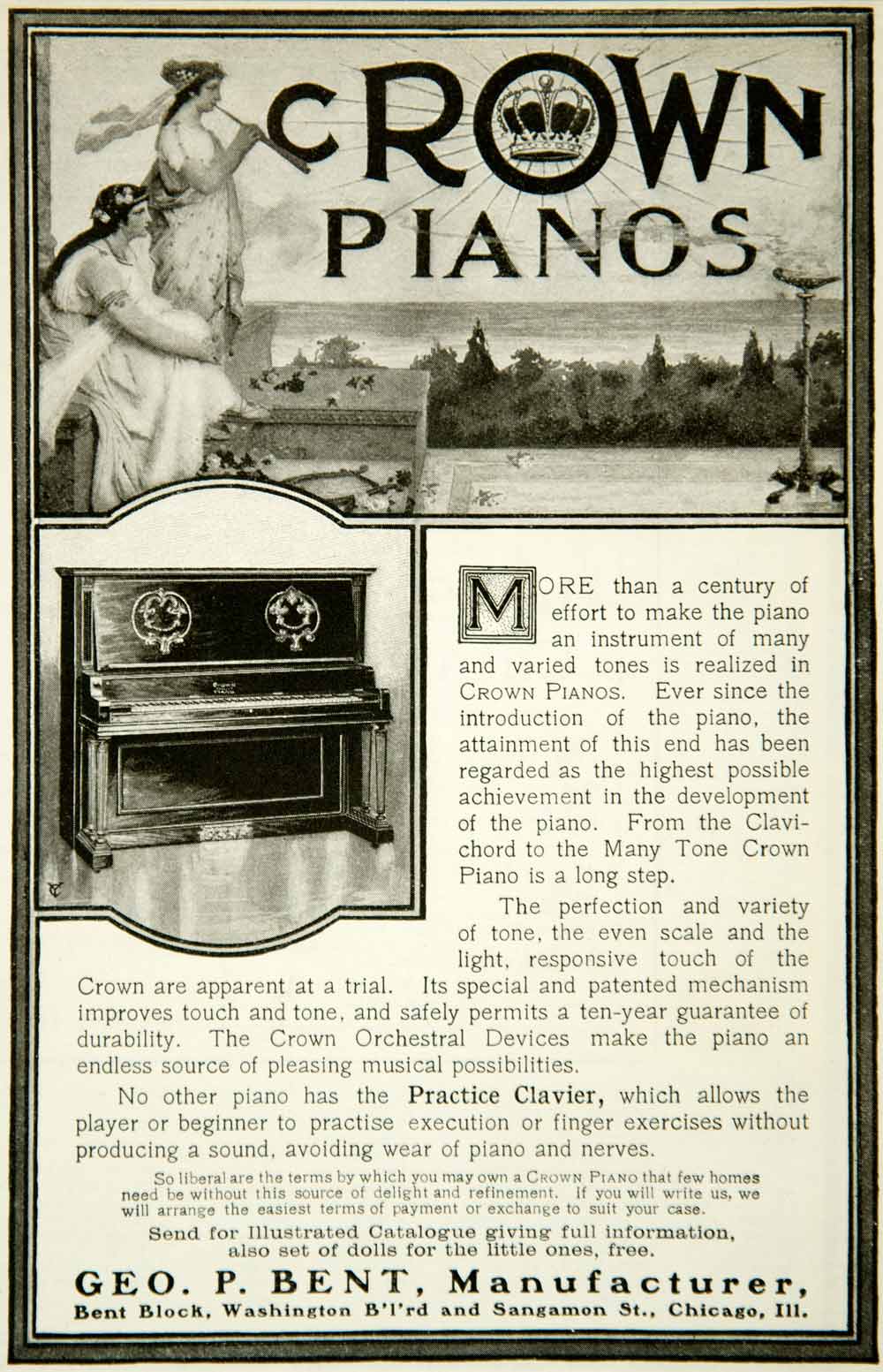 This is an original 1900 black and white print ad for Crown Pianos from Geo. P. Bent Manufacturers in Chicago, Illinois.