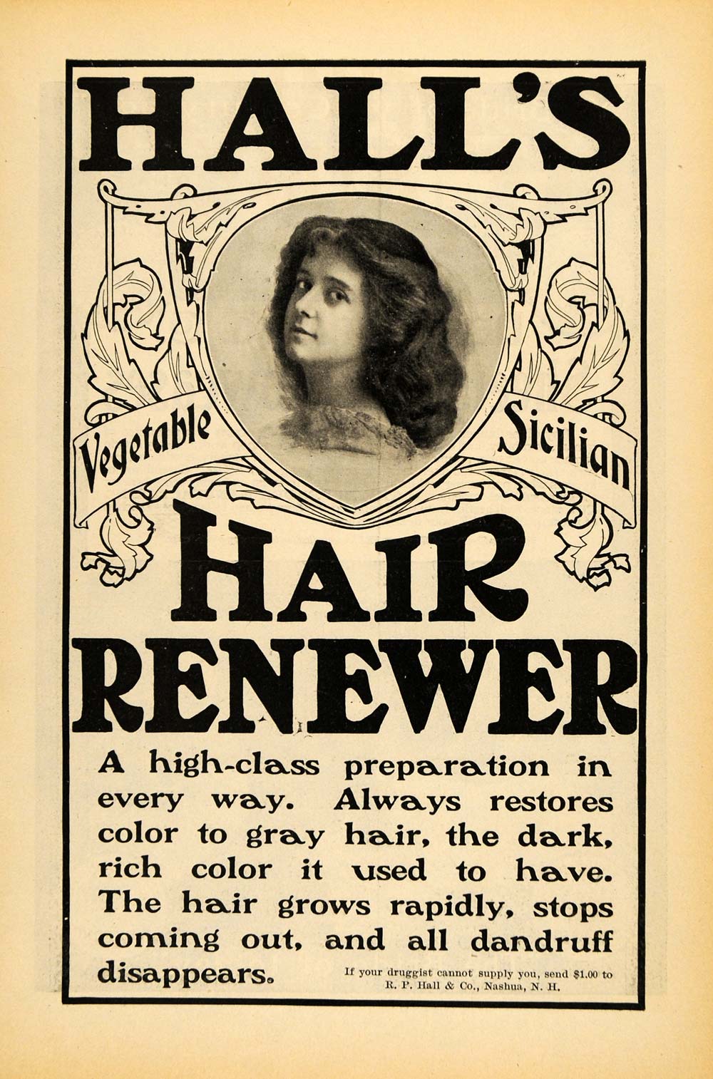 This is an original 1900 black and white print ad for Hall's Hair Renewer. The ad writes, "Always restores color to gray hair, the dark, rich color it used to have. The hair grows rapidly, stops coming out, and all dandruff disappears".