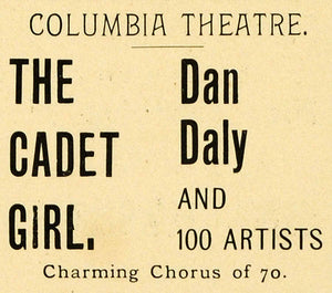 This is an original 1900 black and white print ad from the Harvard Lampoon for a production of the Cadet Girl at the Columbia Theater, starring actor Dan Daly, with a chorus of 70.