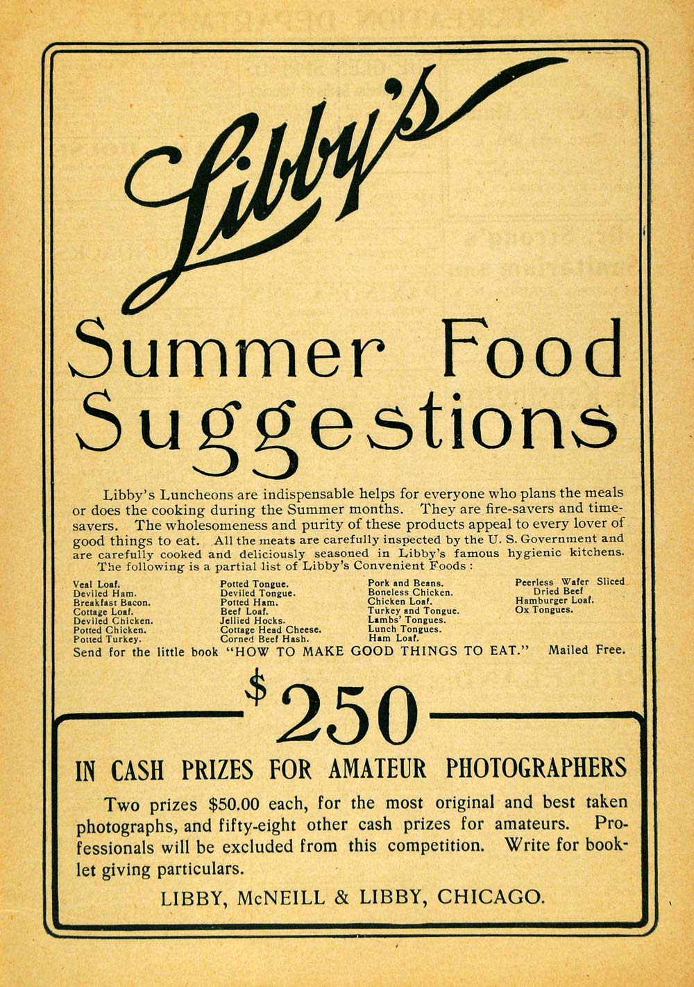 This is an original 1900 black and white print ad for Libby's Food Suggestions by Libby, McNeill & Libby, Chicago.