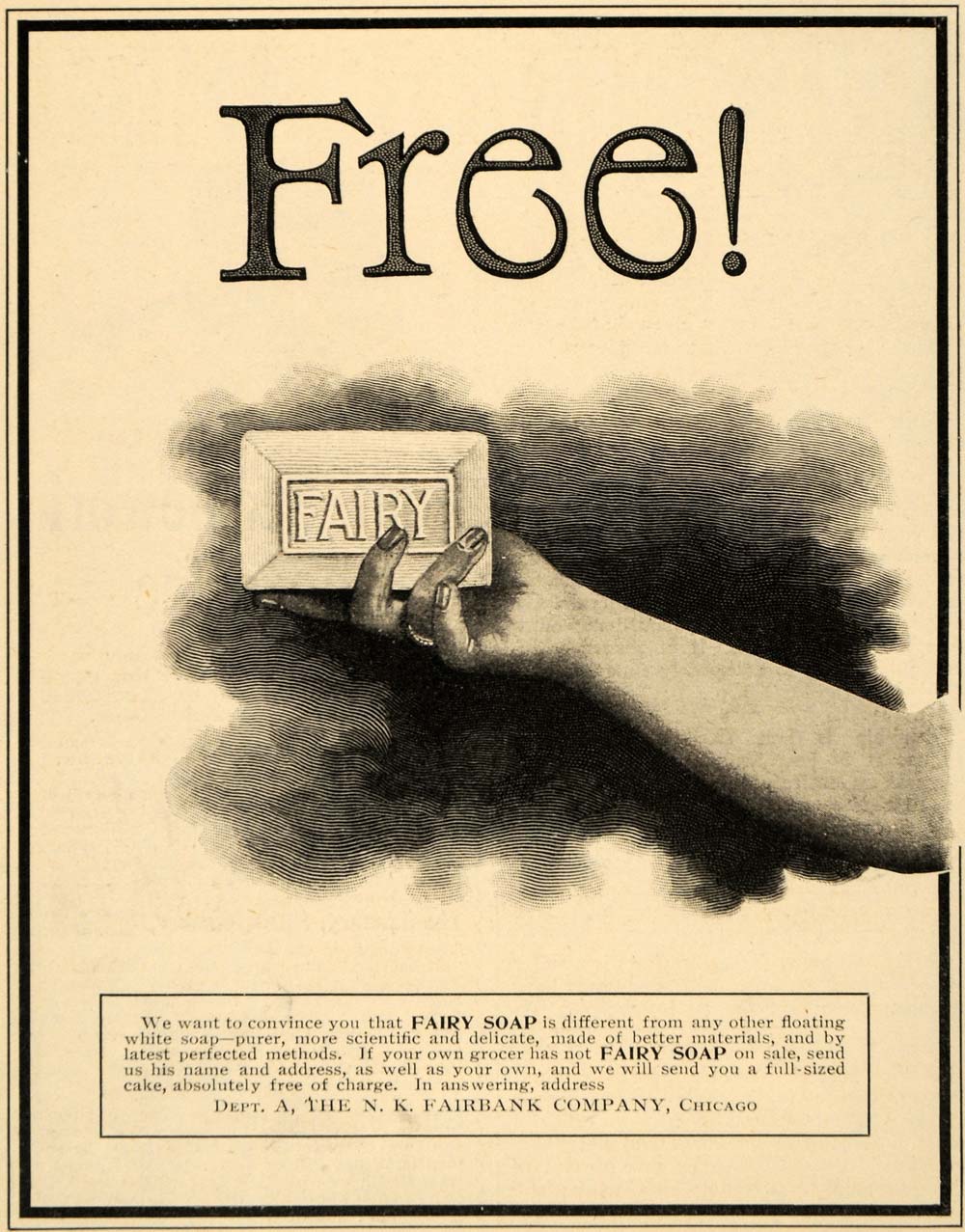 Fairy's Soap. Nathaniel Kellogg ÒN. K.Ó Fairbank, a Sodus, New York native, was the founder of the N. K. Fairbank Company. After the Civil War, Fairbank moved to Chicago where he began importing cottonseed oil and manufacturing soaps. While Fairy Soap, named after the first four letters in FairbankÕs name, was one of his most popular products, he also produced animal and baking products.