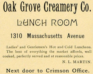 This is a tiny original 1900 black and white print ad from the Harvard Lampoon for the Oak Grove Creamery Company Lunch Room, located next to the office of the Harvard Crimson at 1310 Massachusetts Avenue in Cambridge, Massachusetts.