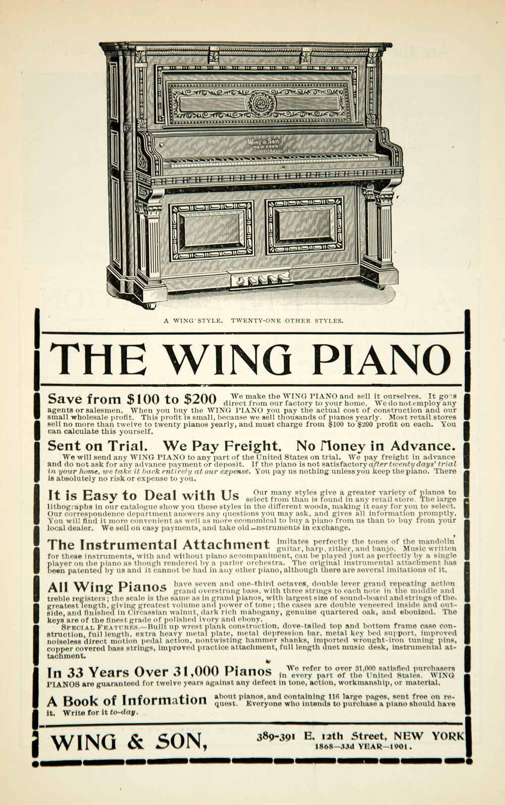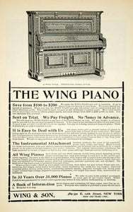 This is an original 1900 black and white print ad for pianos that were made and sold by Wing & Son of 389-391 East 12th Street, NYC.