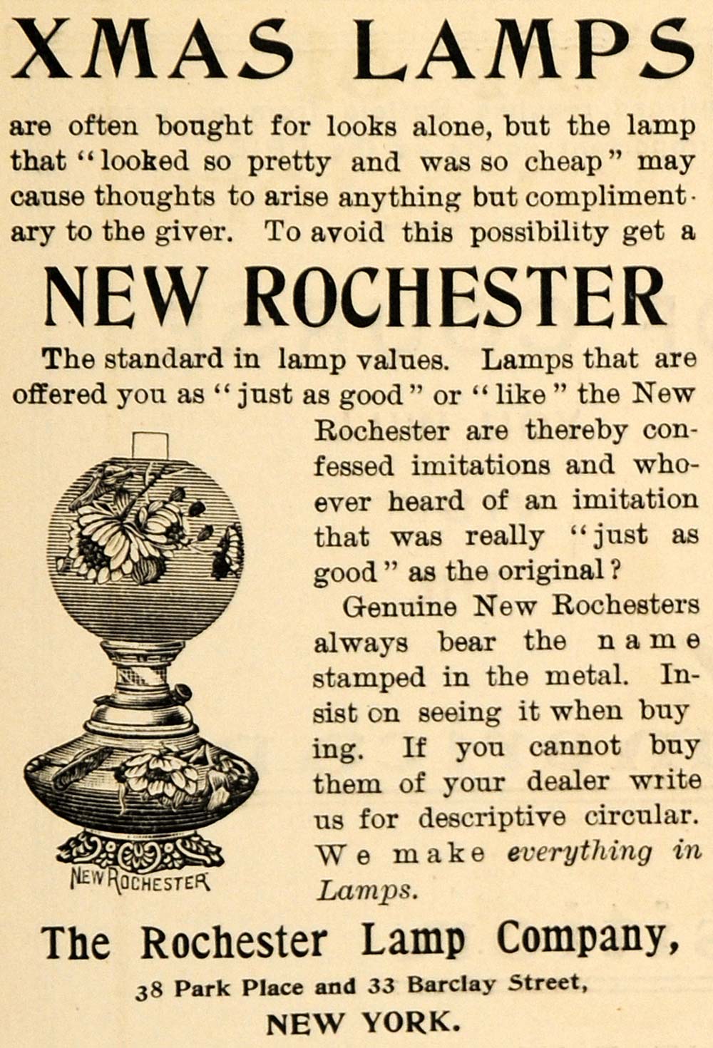 This is an original 1900 black and white print ad for the New Rochester XMAS Lamps from Rochester Lamps Company located at 38 Park Place and 33 Barclay Street, New York.