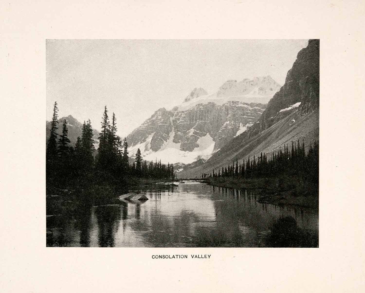 This is an original 1900 black and white halftone print of "Consolation Valley," located in the Canadian Rockies.