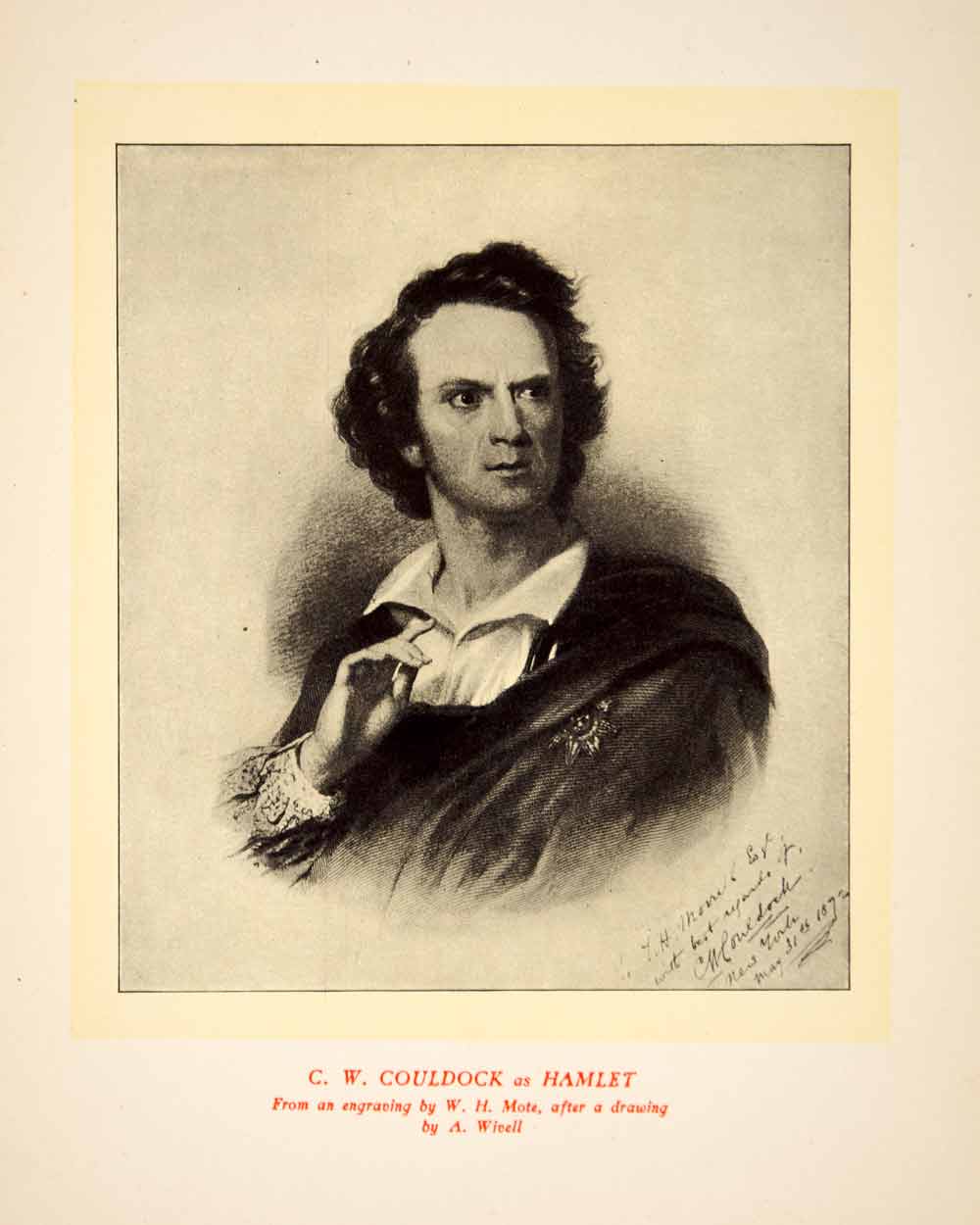 This is an original 1900 two-color lithograph of a drawing by Abraham Wivell that portrays English stage actor, Charles Walter Couldock (1815-1898), dressed in costume for his title role in "Hamlet", by William Shakespeare.