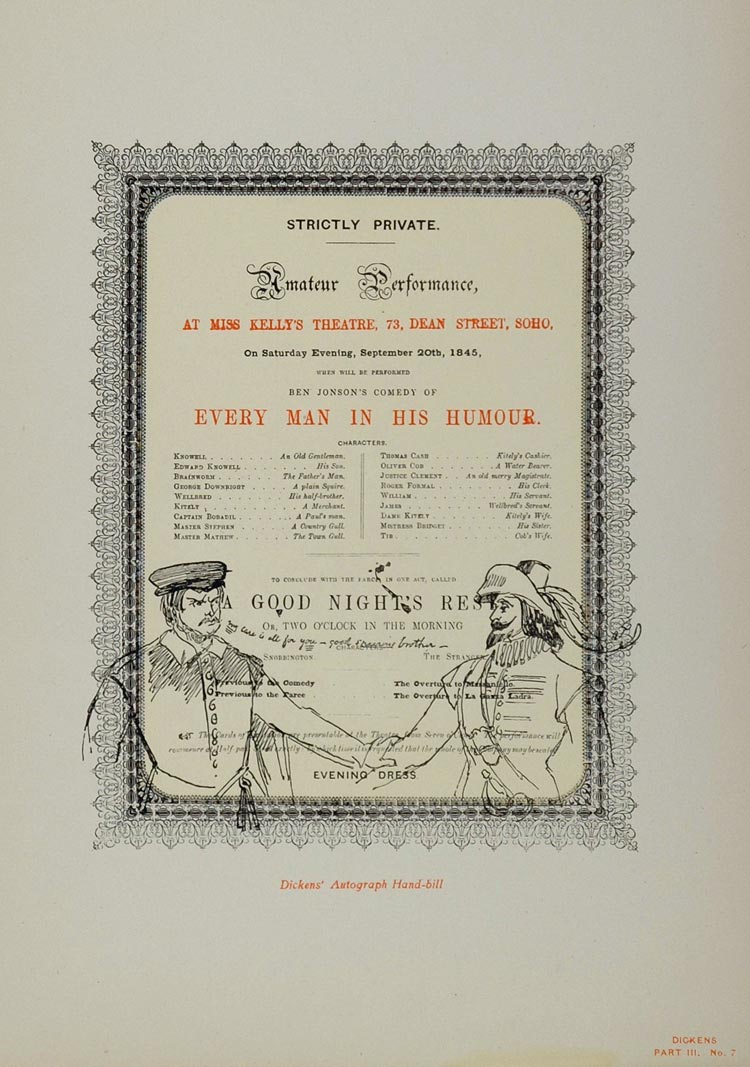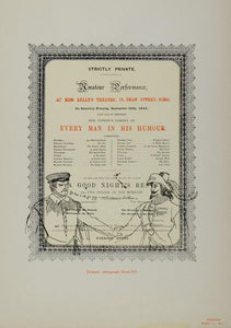 This is an original 1900 three-color lithograph of an 1845 playbill advertisement for a private amateur performance at Miss Kelly's Theatre on Saturday evening, September 20, 1845. The shows listed are Ben Jonson's comedy "Every Man in His Humour" and "A Good Night's Rest."