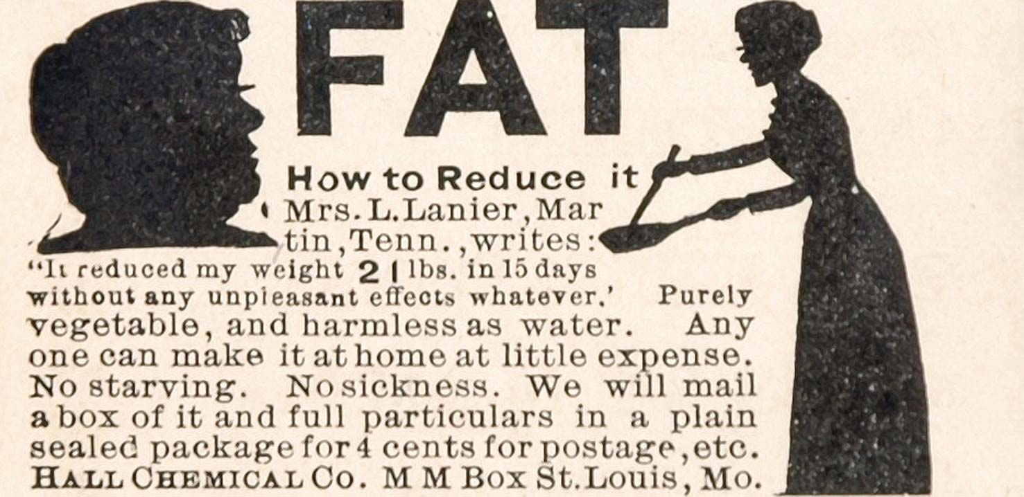 This is an original 1900 black and white print ad from the Hall Chemical Co., St. Louis, MO for a product to reduce fat. The ad has a testimonial from a Mrs. L. Lanier of Martin, Tenn. who lost 21 lbs. in 15 days.