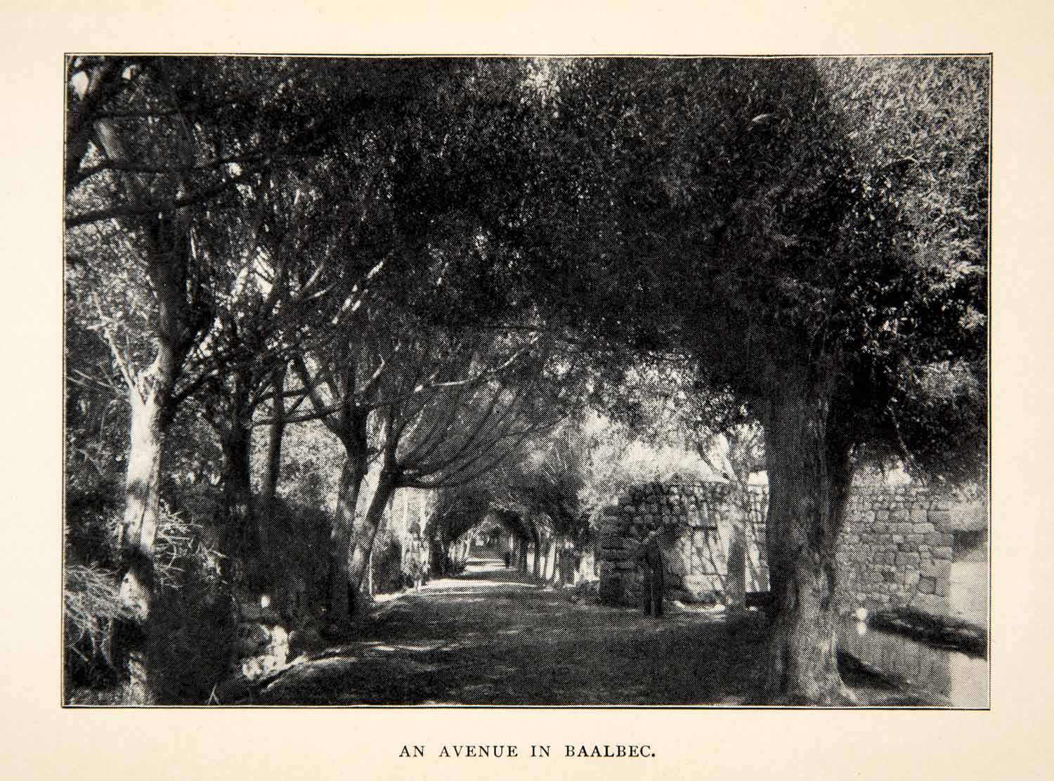 This is an original 1900 black and white halftone print of a beautiful tree-lined avenue in Ballbek, Lebanon.