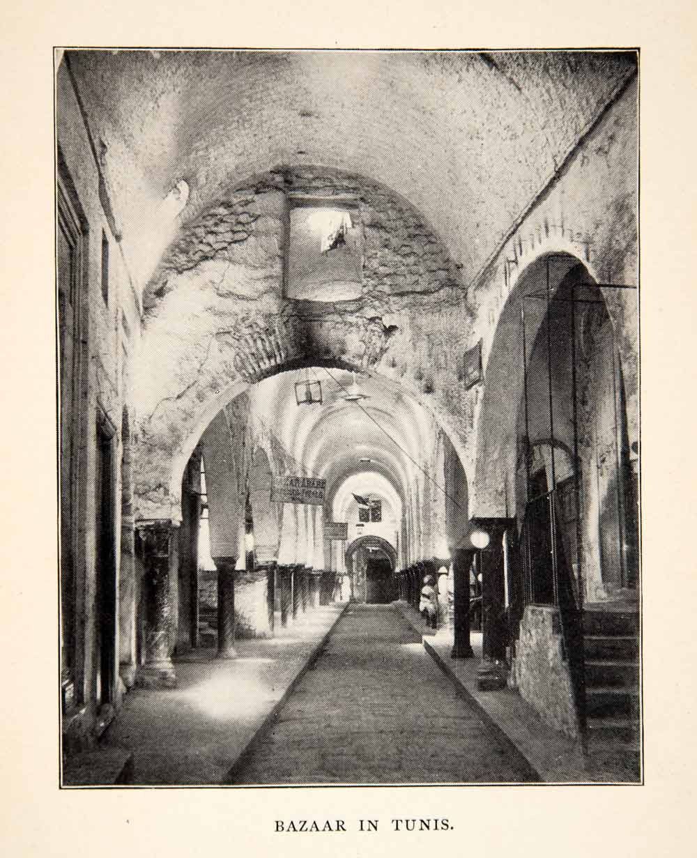 This is an original 1900 black and white halftone print of a bazaar in Tunis, Tunisia, in northern Africa. A bazaar is a traditionally enclosed marketplace found throughout northern Africa and the Middle East.