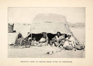 This is an original 1900 black and white halftone print of a camp of Bedouin people who are en route to Tunis from Carthage in Tunisia, North Africa. Bedouins are traditionally desert dwelling, nomadic people.