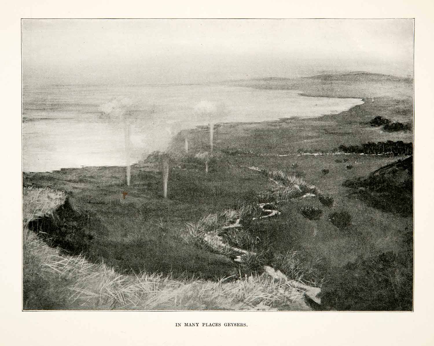 This is an original 1900 black and white halftone print of a number of Geysers in Africa Erupting near a coastline with a pathway going around the geysers.